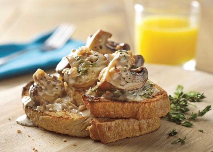 - Rooster het volkorenbrood en verdeel de paddenstoelenragout erover.